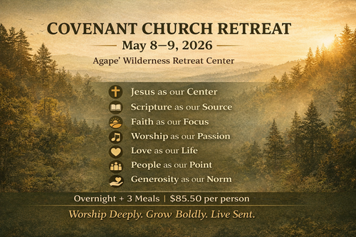 On May 8–9, 2026, Covenant Church will gather at Agape’ Wilderness Retreat Center for a special overnight retreat designed to help us rediscover and deepen what makes Covenant… Covenant.